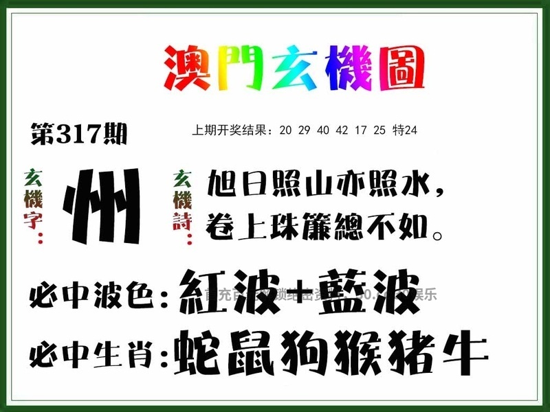 玄机诗:旭日照山亦照水,卷上珠簾總不如。 必中波色:红波+蓝波 必中生肖:蛇鼠狗猴猪牛 |